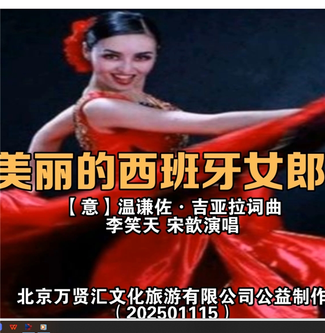 《西班牙女郎》是意大利作曲家温谦佐·基亚拉创作的经典歌曲,中文版由应南、薛范译配。作品以西班牙文化为灵感,融合意大利歌剧抒情与西班牙圆舞曲、华尔兹的节奏,形成独特的艺术风格。其创作运用西班牙民间音乐元素,展现对西班牙女性形象的赞颂。这首歌由特邀旅欧著名歌剧女高音歌唱家、卡门的扮演者宋歆与李笑天合唱。