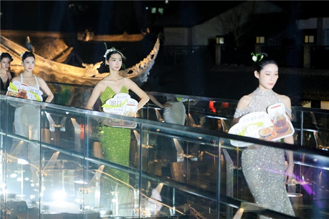 本次大秀选址荷田水铺文殊坊店3楼屋顶花园,借助文殊坊的飞檐青瓦构筑天然T台,实现了千年古刹的沉稳底蕴与高定时尚的摩登活力,在品牌大赏中荷田水铺品牌总监连杰主持并且介绍了茜恩高定设计团队以七款山野茶为灵感,融合了自然元素与东方美学,将茶汤色泽、药食纹理转化为可穿戴的艺术语言,模特手持联名茶饮杯登台,实现"可穿可饮"的跨界艺术实验。